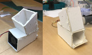 Po przetestowaniu czterech różnych typów wiatraków, zdecydowaliśmy się na najmniejszy z możliwych i rozpoczęliśmy prototypowanie różnych kształtów dysz w kartonie. Zdecydowaliśmy się na modele kartonowe, bo pozwalały nam szybko dopasować i zbadać najlepszy kształt, który wyrzucał płatki śniegu w najbardziej efektowny sposób. Ostateczny kształt projektu był wynikiem trzech próbnych wydruków, wielu prób na makietach tekturowych i eksperymentów z różnymi rodzajami śniegu.